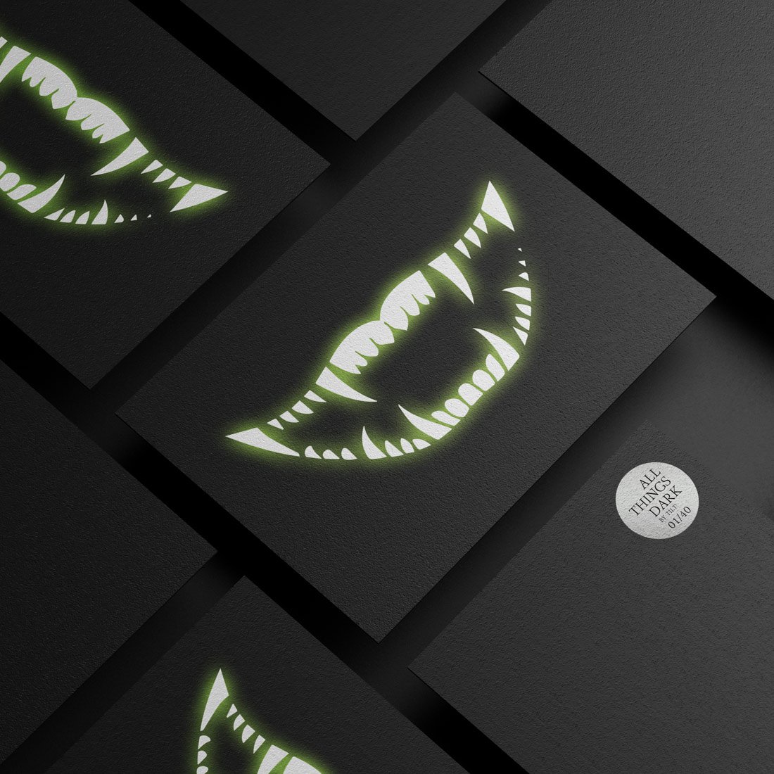 A smile that glows in the dark! Limited to 80 pieces! Phosphorescent ink on 330gr black paper. [15x21cm] Silk printed by Tind, designed by TILT!