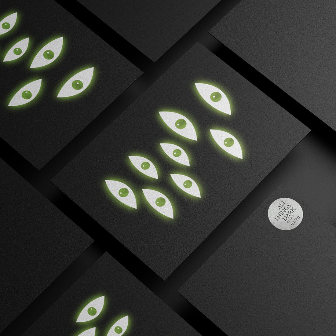 Eyes that glow in the dark! Limited to 80 pieces! Phosphorescent ink on 330gr black paper. [15x21cm] Silk printed by Tind, designed by TILT!